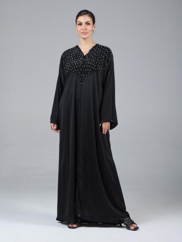 Bulk Zoom Simple Abaya with Black Crystal Handwork on the Front in Black and Beige Bulk Zoom Simple Abaya with Black Crystal Handwork on the Front in Black and Beige